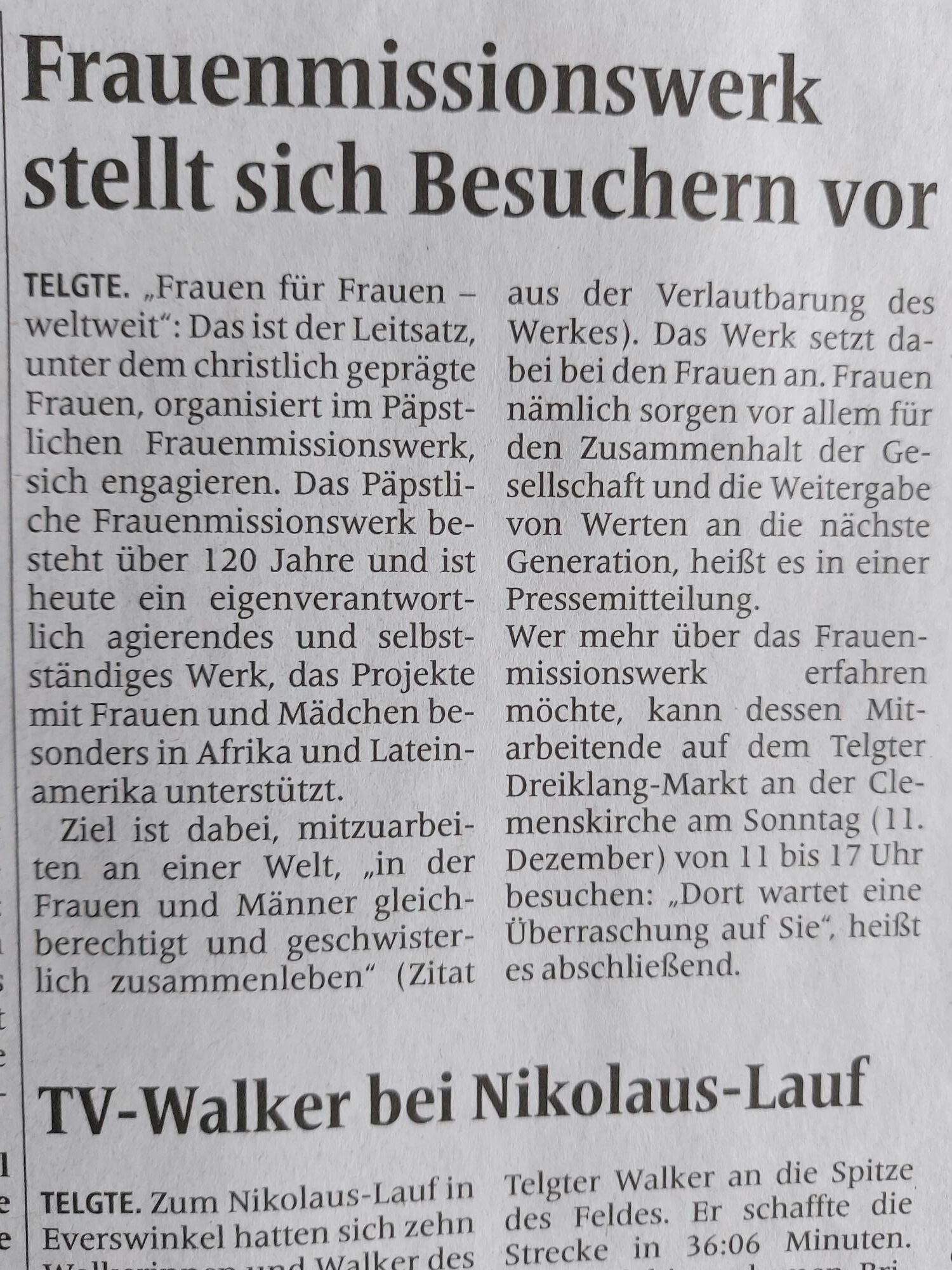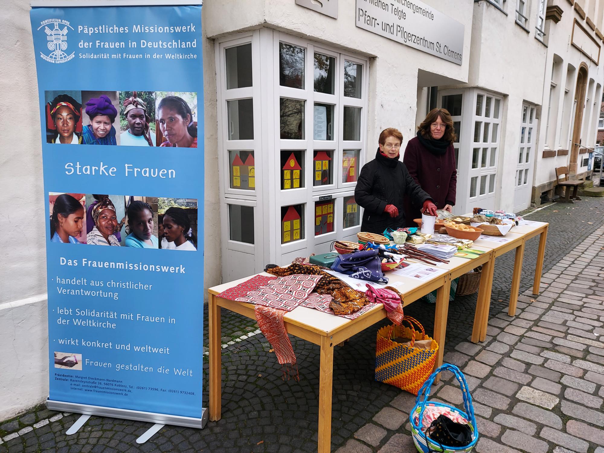 Auf dem Telgter Dreiklang-Markt am 11. Dezember von 11:00 Uhr – 17:00 Uhr stellten Elisabeth Drieling und Dorothea Sattler an einem Informationsstand das Frauenmissionswerk vor und gaben dort Auskunft über das Anliegen und Wirken des Werkes.