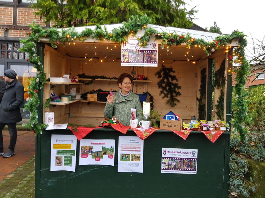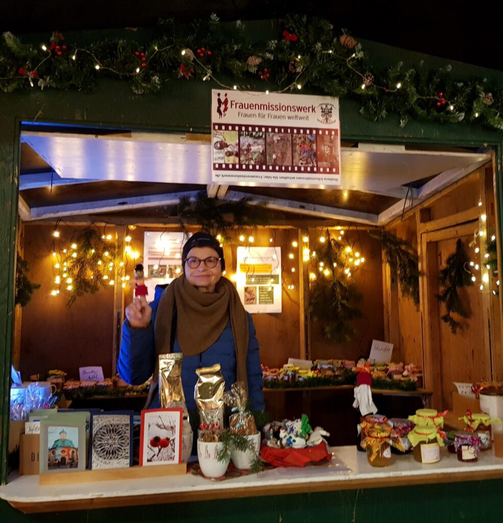 Selbstgemachte Marmeladen und Karten, Fingerpüppchen aus Bolivien, fairgehandelter Bio-Kaffee aus Ruanda – Informationen zur Projektarbeit des Frauenmissionswerkes – und tolle Gespräche- all das boten Sabine Adler und Elisabeth Drieling in der Weihnachtshütte auf dem Dreiklang-Markt an 3 Tagen an.