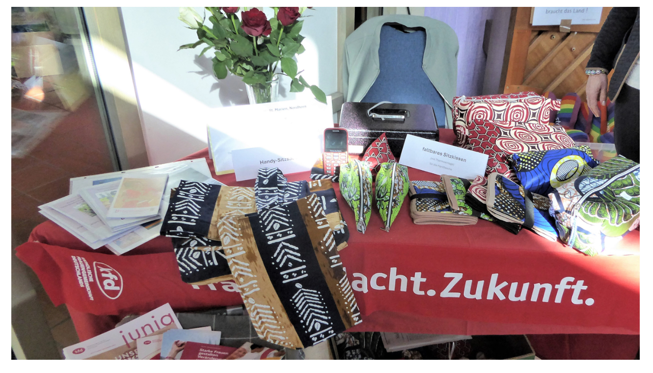 Die kfd stellte die Verbindung von der „kfd-Nähwerkstatt St. Marien“ Nordhorn, dem Abraham-Geiger-Kolleg Potsdam und dem Frauenmissionswerk vor, das Nähen von Gebetschals für das Kolleg und die anschließende Spende an das Frauenmissionswerk. Ebenso konnte sie über die Arbeit des Frauenmissionswerks und ihre Projekte berichten. Insbesondere wurde das Witwenprojekt in Ruanda vorgestellt. Dazu gehörte auch der Hinweis auf die Krankenversicherung von Witwen, die den Beitrag von 3€ im Jahr kaum bezahlen können. Zur Unterstützung der Frauen hatte die „kfd Nähwerkstatt“ aus afrikanischen Stoffen verschiedene Teile genäht, die am Infostand zum Verkauf angeboten wurden. Der Erlös ist für das Witwenprojekt in Ruanda bestimmt.